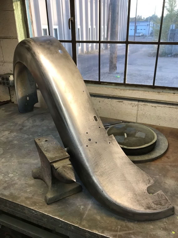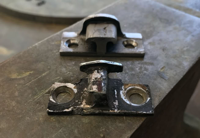 • I will be pulling significant photos from this site as well as my own to document step-by-step progress. As of today, however, Mike has pulled all four fenders and the running boards, stripped and sanded down to bare metal, planished various dents, cut out and replaced metal where there was deep rust, straighten, polished and re-fit the chrome center hinge for the bonnet, made from scratch (using a section out of a bent over no parking sign!) the worn and broken fitting that allows the bonnet wings to lift, refashioned the rear hinge holder apparatus and will insert plugs to receive screws to allow removal of the wings when access to the whole engine is necessary. He has ordered special epoxy two step primer and has a suggestion for me to look at paint samples from the same company. In addition he made a suggestion that black fenders and British racing green body might be a good combination. He has also come up with a unique way to use the triumph latches which is the best solution so far. It will involve him resetting to a more advantageous position the metal shelves on the wings which are grabbed by the latch.