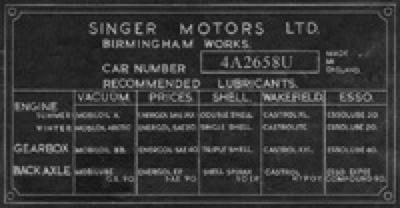 The brass Name and Number plate identifies recommended lubricants, the Company, place of manufacture and the Car Number (eg A1579S). This is the number required for vehicle registration and must match the serial number stamped on the chassis.