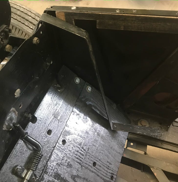 - I located a pair of metal straps which resembled the ones we installed on the outboard sides of the elevated wooden footrests. I panicked when noticing they fit under these wooden pieces with pre-drilled holes in the middle of each piece (driver and passenger). One side had the nuts welded on the strap like the others and the other did not. I have run out of BSF slotted screws, so will probably retap or bore out to replace with 1”x ¼” 20 screws.