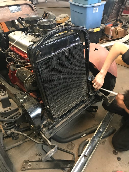 - Took the $500 chromed radiator shell to Brad for fitting to adjust the front bumper.
