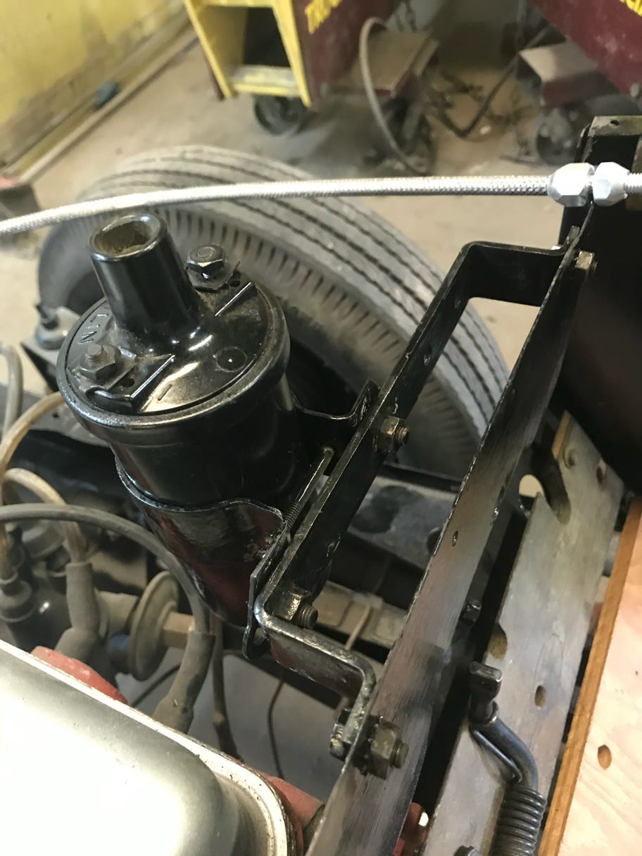 - I spent time finding and bolting down bracket which hold first the brake fluid reservoir and then the horn and coil on the passenger side of the engine.