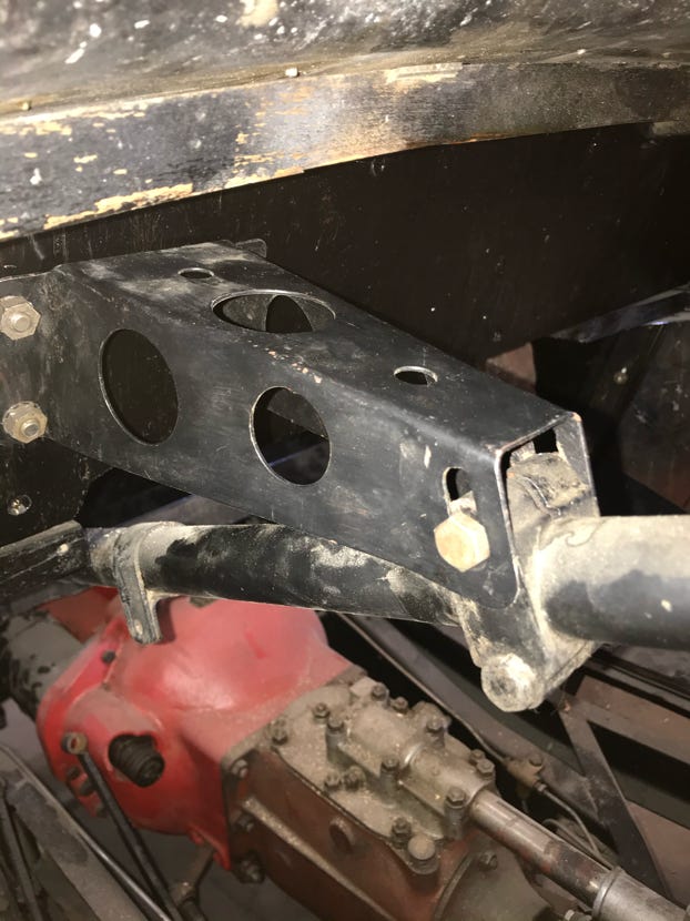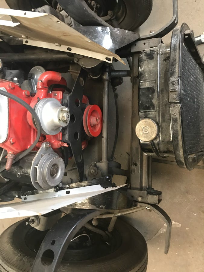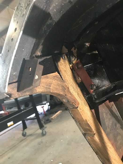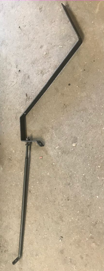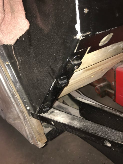 - Then I located two more matching straps which looked as if they held up the spare tire pan in the rear, but after consulting several photos, I discovered they wrap from under the dashboard, through the firewall, across underneath the battery pan and form a right angle bracket on the front of the firewall onto which a threaded rod screws and extends down to the frame! This will be fun to fit and might interfere with the wooden piece that fits across and underneath the battery pan