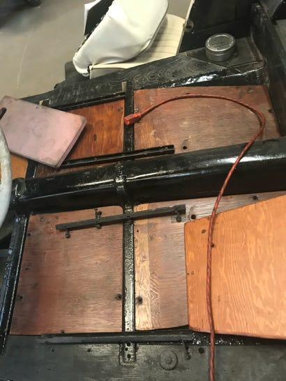 - Retapped the fixed nuts in the floorboard to ¼” - 20 threads. It’s now ready for the new plywood floorboard as soon as I get it painted. This will accommodate the accelerator pedal and give us a place to attach the new accelerator cable.