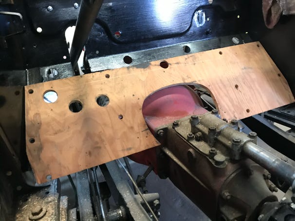 - Amazed to find that the floorboard pieces under the feet of driver and passenger are missing (another Bruce omission?). Nonetheless, I brought light cardboard and made two patterns. I found a scrap of ½” plywood at home and cut the two pieces so they would hug the gearbox and skirt around the large bolts that fasten the main ash frame to the metal frame. Will custom fit them next time.