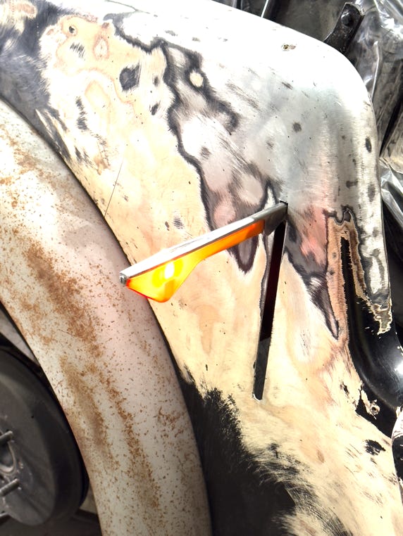 • Finding a body shop that will be willing to smooth out the dents and welds and ill-fitting trunk parts has been very hard to find. I have a new clue which I will follow up, but those with whom I've already talked either have no interest in taking on the project, or want outrageous sums of money to even consider it.