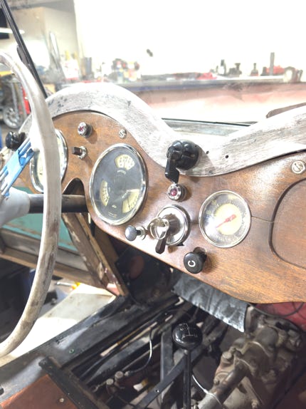 • Kevin had fashioned door latches, found and attached the license plate holder and light (albeit upside down – – an easy 180° fix), finished wiring the dashboard instruments and lights, affirmed that the brakes were working, the lighting system was working, the horn, the trafficators flipping and lighting (the left one still a bit sticky) and the motor running smoothly.