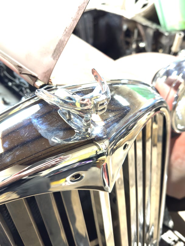 • I brought the radiator ornament and had to borrow some lubricant to get the chromed nuts to move down the bolts. It's going to be tricky to fit this on the radiator shell after cutting a rubber gasket to fit underneath the ornament and possibly putting lock washers underneath the nuts. Kevin has done some magic before…