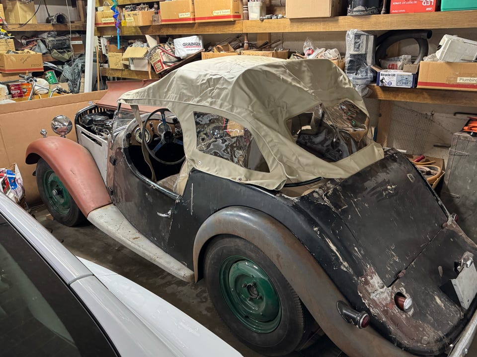 • Once home, I started up the engine for the first time and drove the Singer 30 feet into the garage. That was all that was necessary to realize it still has a long ways to go. Compared to the MG everything is too stiff or too loose. The short drive, however, gave me a long laundry list of things to handle before I turn it over to someone to do the bodywork and painting. I have a list of 13 local body shops which I intend to interview in the near future. More likely I will have to do some serious sales talking to get them to agree to do the job for way less money than my previous quotes.