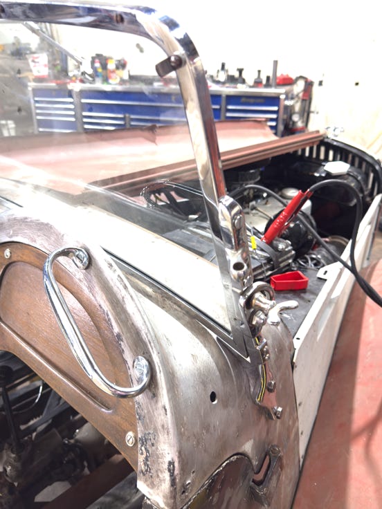 • One of the most serendipity discoveries of the seven year process happened this week when Brad and Kevin were discussing the rough idle of the engine and what that strange crimped copper tube leading off of the front carburetor was meant for, and lightbulbs went on! Kevin and I had discussed the fact that the windshield wiper was run by vacuum from somewhere, but neither of us could find the source. The cramped copper was the source! And once some rubber tubing was hooked from it and snaked up around the windscreen to the wiper motor, we not only have working windshield wipers, but a very smooth idle to the engine!