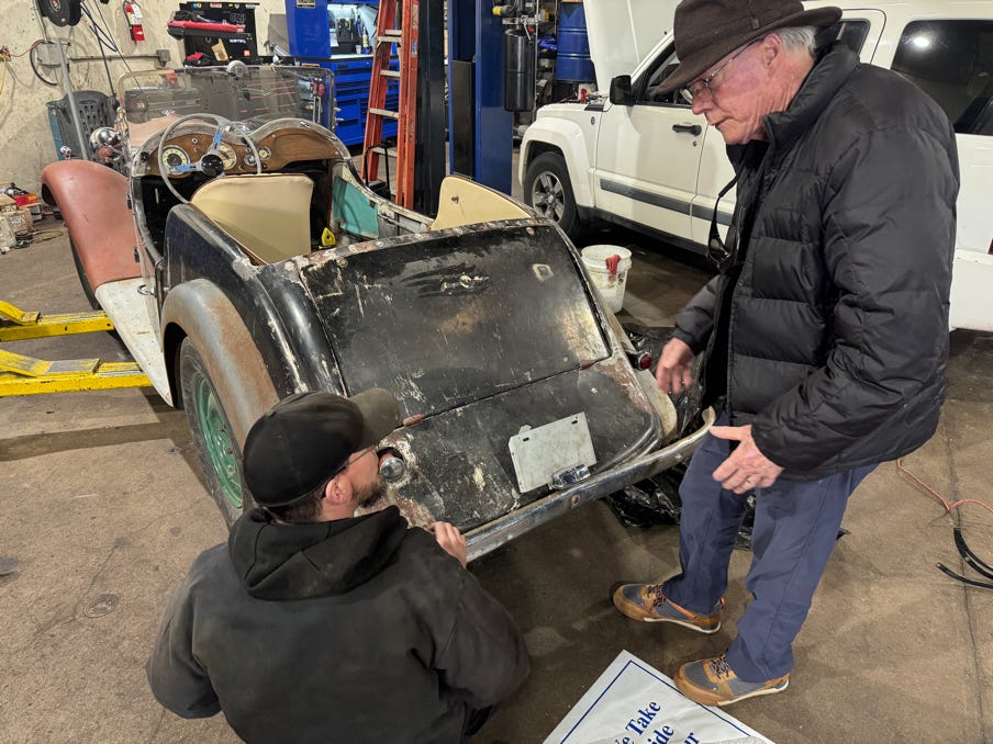 • Went to see Kevin and Brad and made arrangements for Kevin to drive and Brad follow in the pick up carrying my tools and all of the spare parts and bring the little singer home for the first time in seven years! At that point they can take the MG back to the shop and start some needed work on it. It's been a journey…
