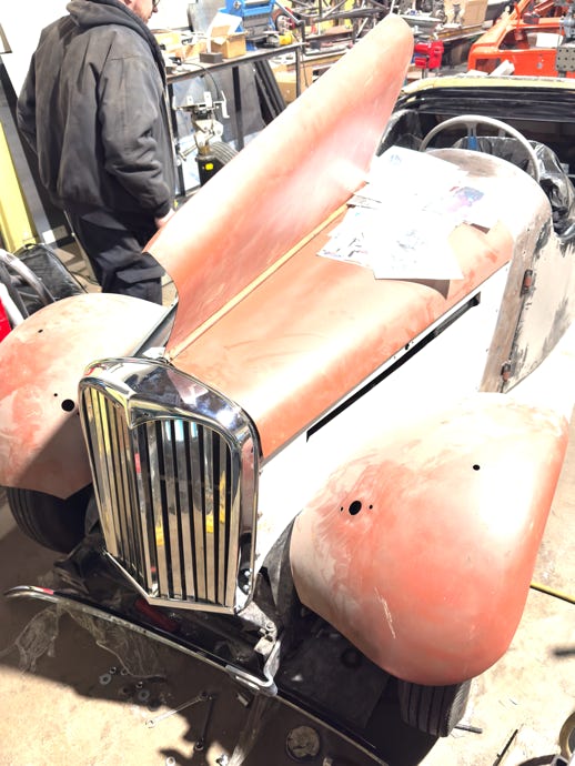 • I will be pulling significant photos from this site as well as my own to document step-by-step progress. As of today, however, Mike has pulled all four fenders and the running boards, stripped and sanded down to bare metal, planished various dents, cut out and replaced metal where there was deep rust, straighten, polished and re-fit the chrome center hinge for the bonnet, made from scratch (using a section out of a bent over no parking sign!) the worn and broken fitting that allows the bonnet wings to lift, refashioned the rear hinge holder apparatus and will insert plugs to receive screws to allow removal of the wings when access to the whole engine is necessary. He has ordered special epoxy two step primer and has a suggestion for me to look at paint samples from the same company. In addition he made a suggestion that black fenders and British racing green body might be a good combination. He has also come up with a unique way to use the triumph latches which is the best solution so far. It will involve him resetting to a more advantageous position the metal shelves on the wings which are grabbed by the latch.