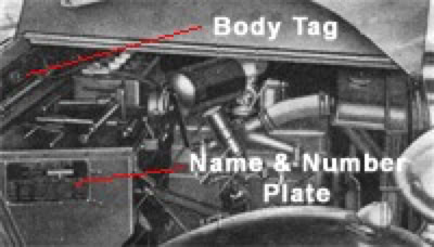 The brass Name and Number plate identifies recommended lubricants, the Company, place of manufacture and the Car Number (eg A1579S). This is the number required for vehicle registration and must match the serial number stamped on the chassis.