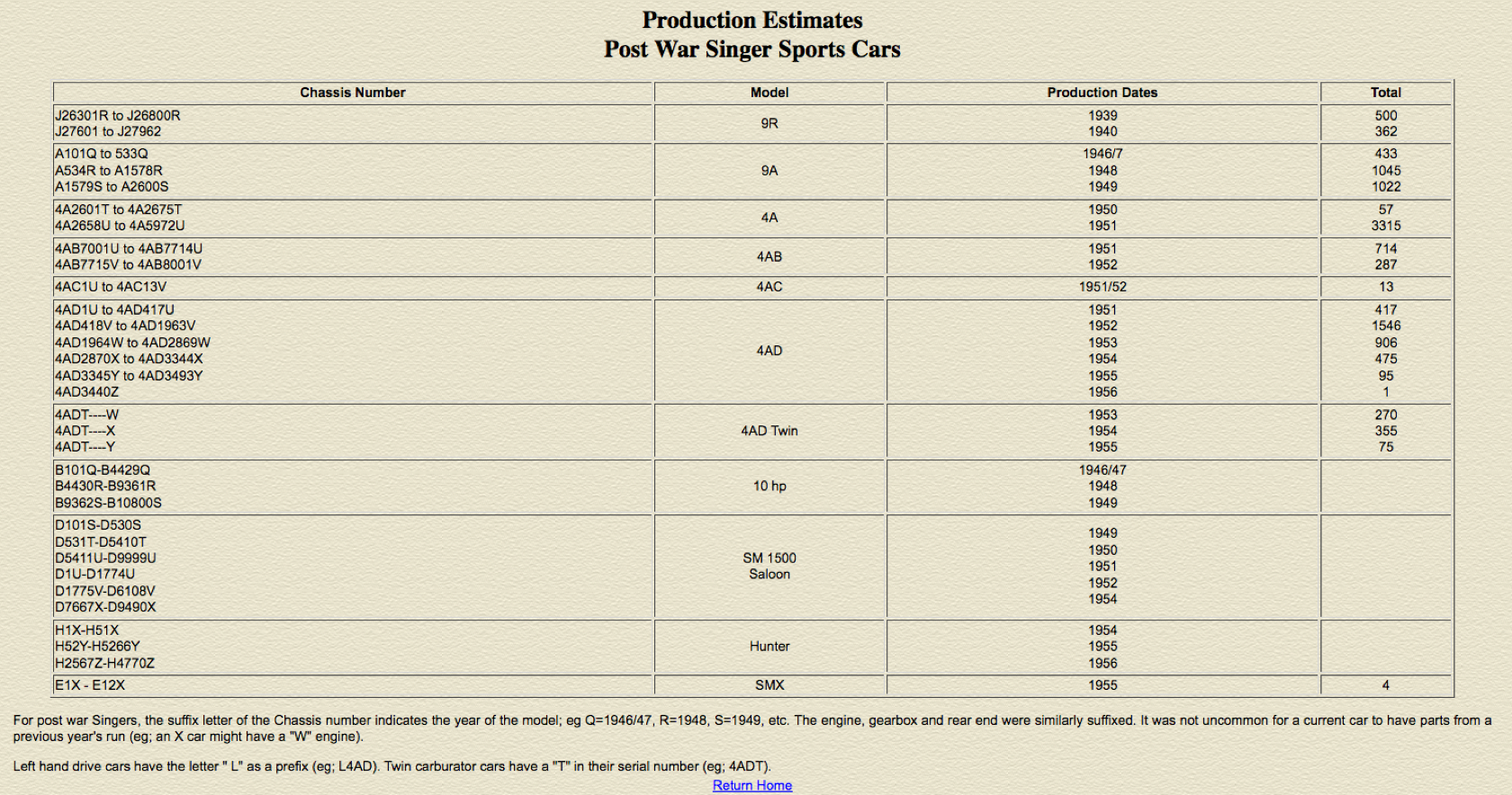 (See (NN Sep/Oct 1992) for full history. Singer Motors of Coventry built about 6,000 roadsters between 1936 and 1954. In 1954 Rootes Motors of England bought them out. First sold in USA by Vaughn Motors in Los Angles, then became Rootes on Pico Blvd. in LA. Rootes sold out to Chrysler of England in about 1967 who then trashed most of the remaining parts. (NN May/Jun 95)